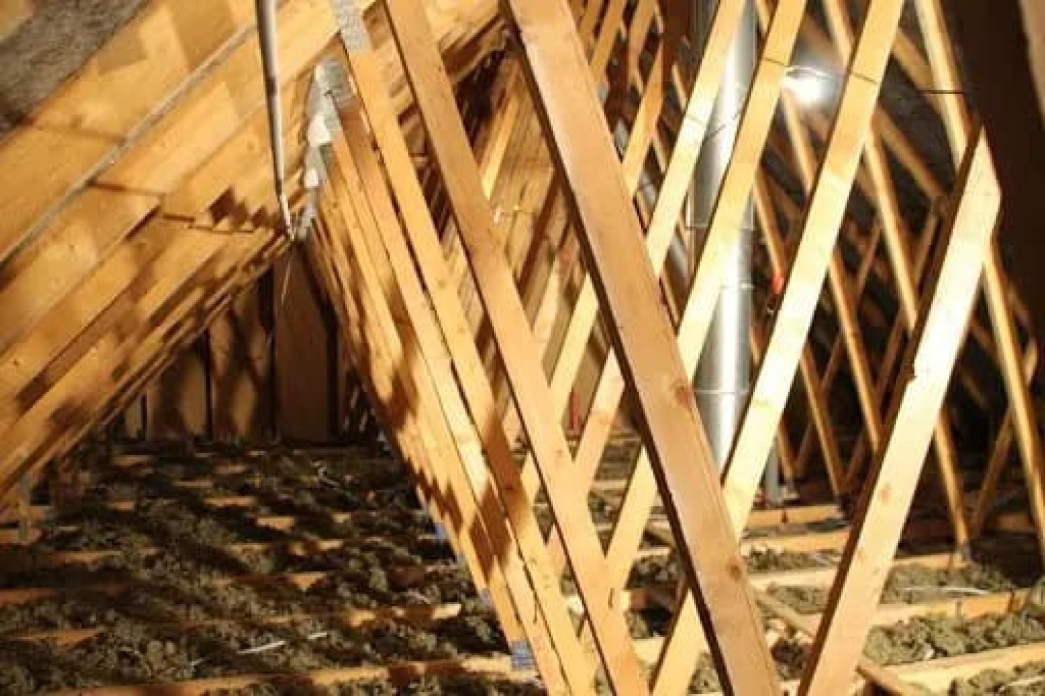 En effet, une charpente non aménageable est caractérisée par deux éléments : d’une part l’entrait bas n’est pas assez fort pour pouvoir porter un plancher conformément aux Eurocodes (150 kgs/m² + les charges d’exploitation). D’autre part, le volume est totalement obstrué par de nombreuses barres de bois comme sur la photo ci-dessous.